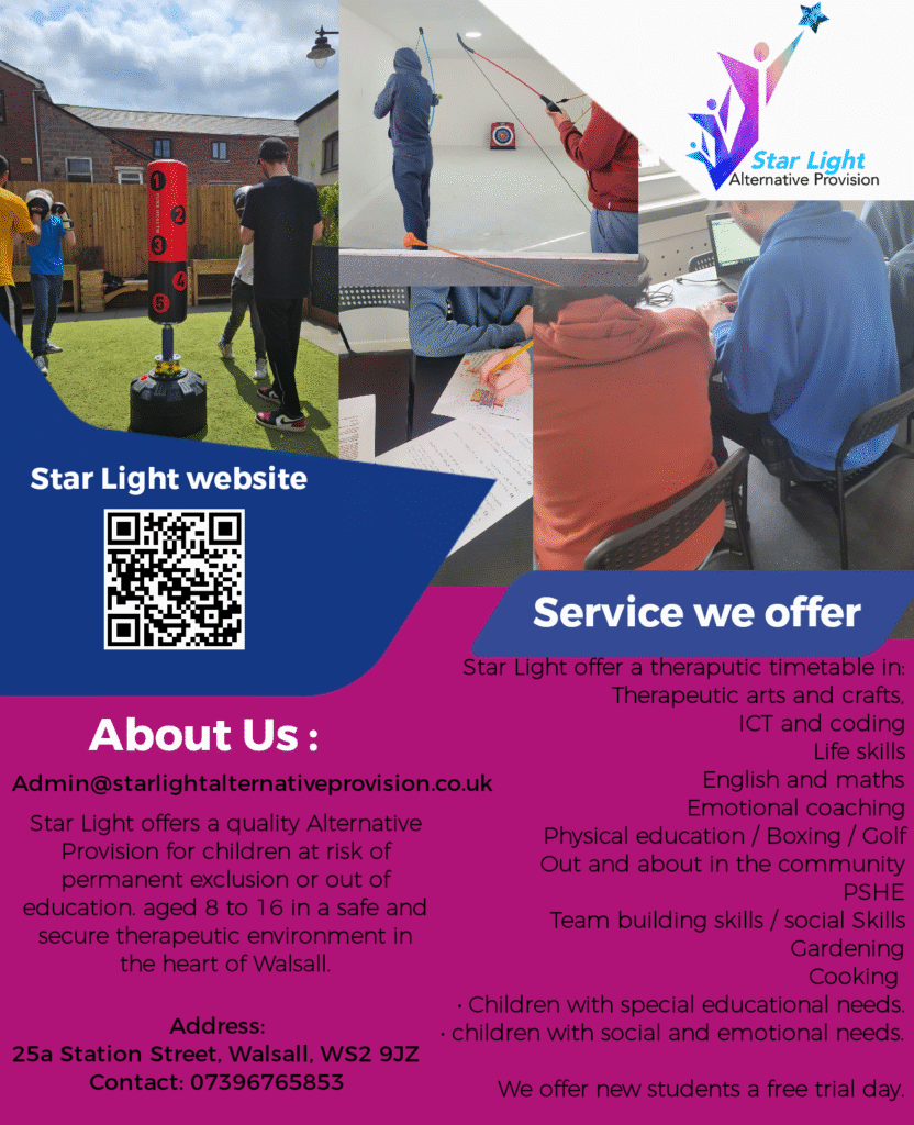 Star Light Alternative Educational Provision provide a therapeutic environment in the centre of Walsall for children in year 7 to year 11. This service is for children that would benefit from a therapeutic approach to education in smaller settings.